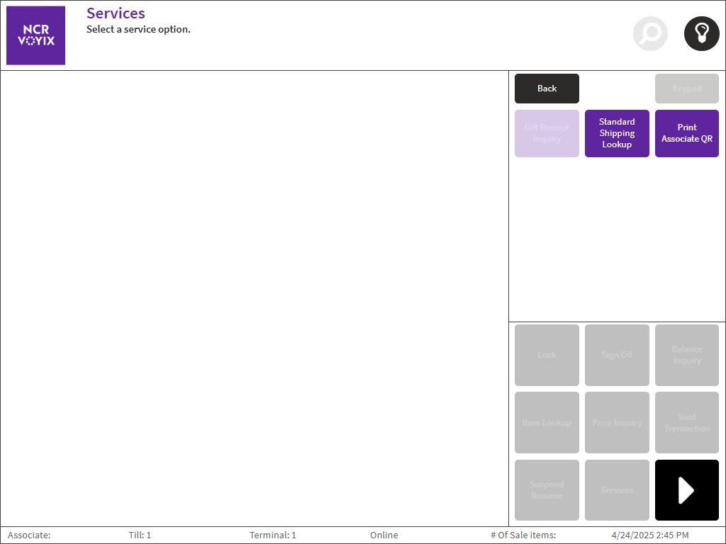 - Open the POS application. From the Sign On screen, select Options > Services. The POS application displays the Services screen.