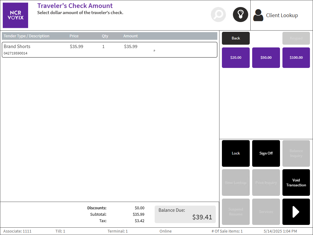 - On the Tender Menu, select Travelers Check. The POS application displays the Traveler’s Check Amount screen.