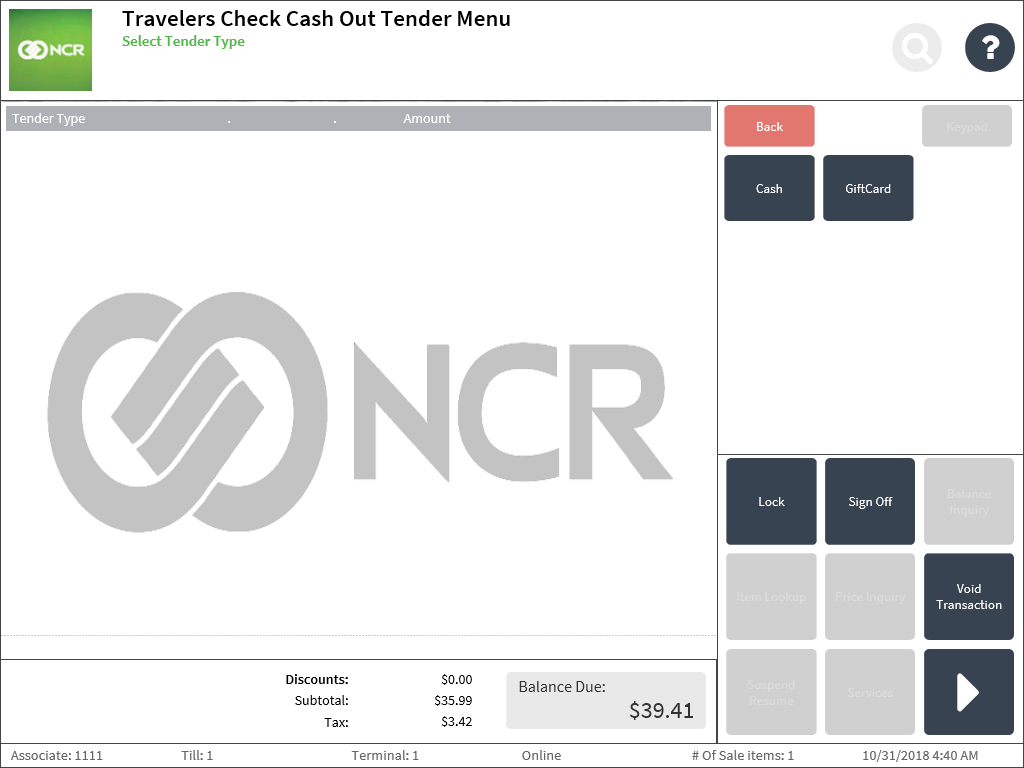 - If the amount entered is more than the balance due, the POS application displays the Travelers Check Cash Out Tender Menu screen, permitting the associate to select a tender type as change due.
