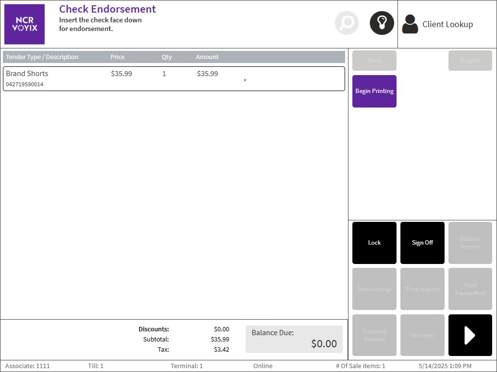 - Insert the check face down into the check printer, and select Begin Printing. The system prints the store’s endorsement information on the back of the check. Note