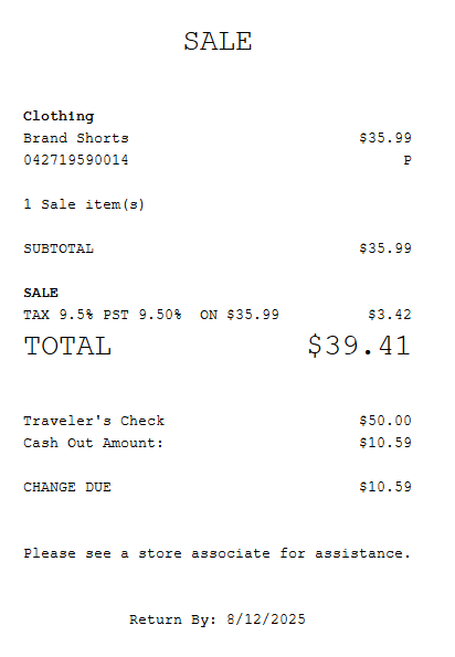 - Select a receipt type. The POS application displays the Change Due screen and prints the receipt.