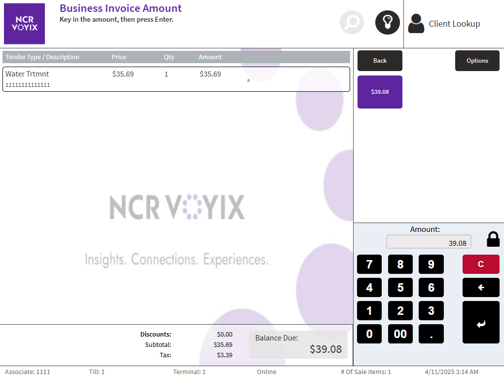 - On the Tender Menu screen, select Business Invoice. The POS application displays the Business Invoice Amount screen.