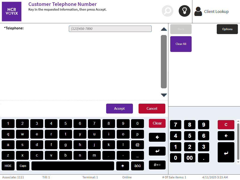 - Enter the Business Invoice Number, and then select Accept. The POS application displays the Customer Telephone Number screen.