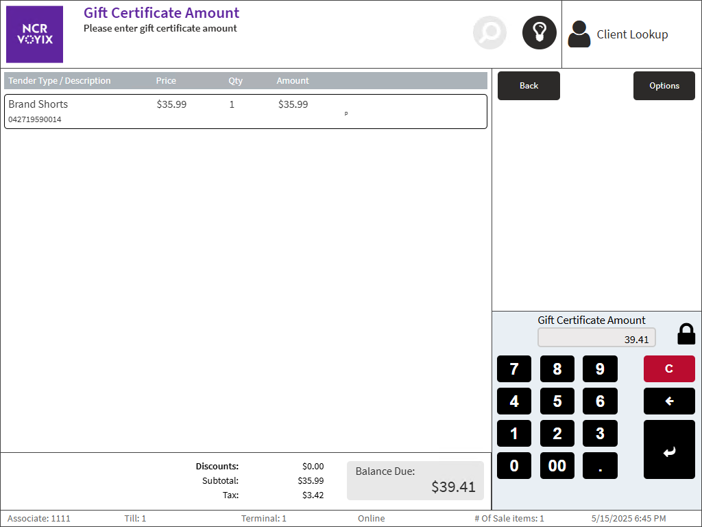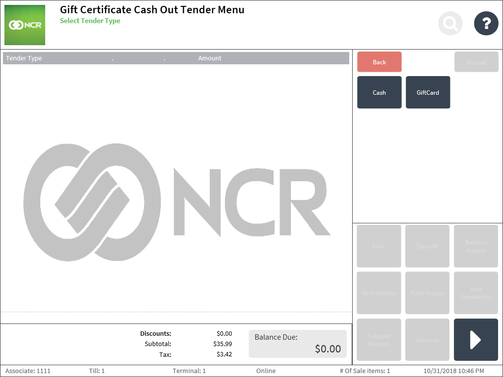 The Gift Certificate Cash Out Tender Menu screen is configurable. For more information, refer to Change Due Setup.