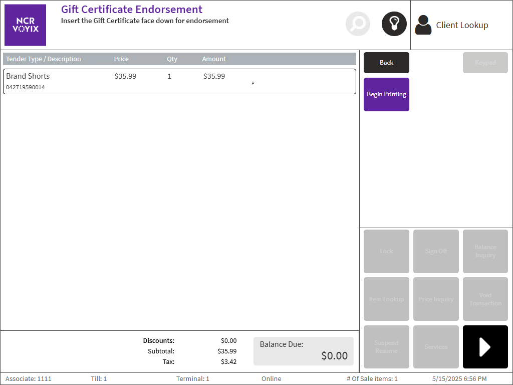 - Insert the gift certificate face down into the check printer, and select Begin Printing. The system prints the store’s endorsement information on the back of the gift certificate. The POS application displays a message that instructs the associate on what to do with the media tender after it has been processed.