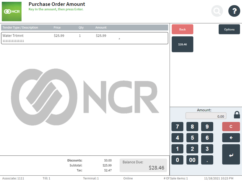- On the Tender Menu screen, select Purchase Order. The application displays the Purchase Order Amount screen.