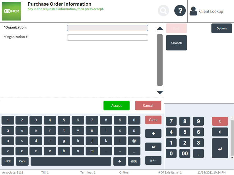 Retailers can accept purchase orders issued by customers. When this feature is configured, the POS application displays the Purchase Order Information screen for the associate to enter the Organization and Organization # information during non-receipted return, transaction-not-found, and offline return transactions. The POS application does not ask for this information during receipted return transactions.