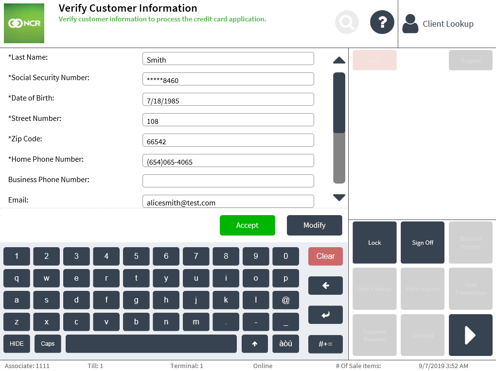 If the information is incorrect or lacking, select Modify to edit the information. The application returns to the Credit Application Customer Information screen. Enter the correct information of the applicant. When the applicant successfully verifies the information displayed on the Verify Customer Information screen, select Accept.