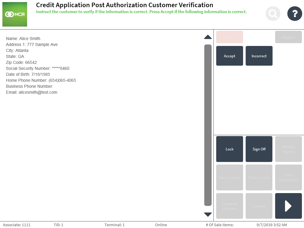 - When the applicant verifies the information, select Accept. The application displays the Credit Application Post Authorization Customer Verification screen.