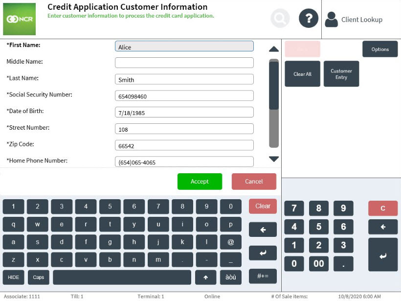 - Have the applicant enter the required information on the PIN pad device. Follow the instructions displayed on the PIN pad. The application displays the Credit Application Customer Information screen with the applicant information.