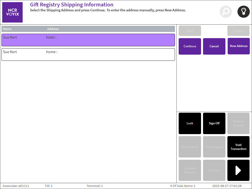- Do one of the following:- Select a shipping address, and then select Continue.NoteIf the selected shipping address has incomplete information, the POS application displays an information message indicating that the missing information should be entered. Select Ok. The application displays the details of the selected shipping address on the Recipient Information screen. Enter the required information, and then select Accept.