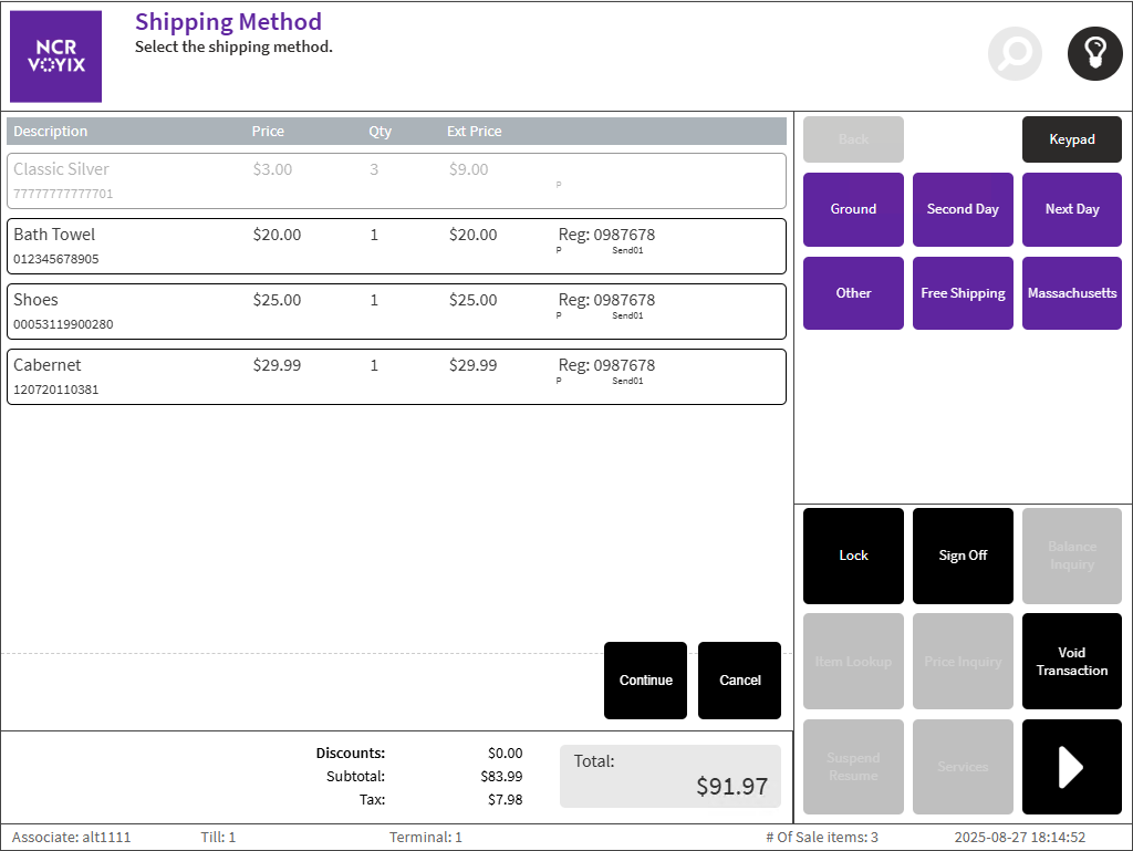 - Select a shipping method for all the items. The list of items is updated with the corresponding shipping fee. While still on this screen, the customer can change the shipping method and the application applies the corresponding shipping fee.