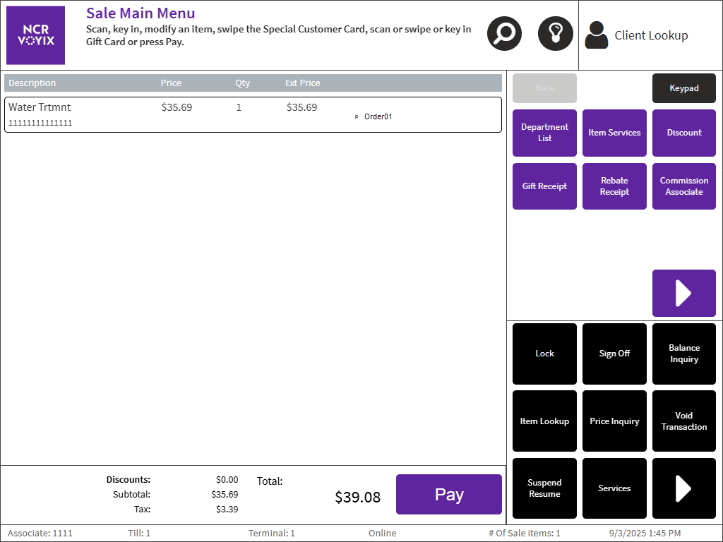 - Pay Now—displays the Sale Main Menu screen and permits the customer to pay the order such as in a regular transaction. An Order01 item description is added to the line item.