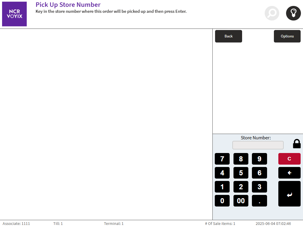 - On the Ship or Pickup screen, select Pickup in Store. The application displays the Pick Up Store Number screen.