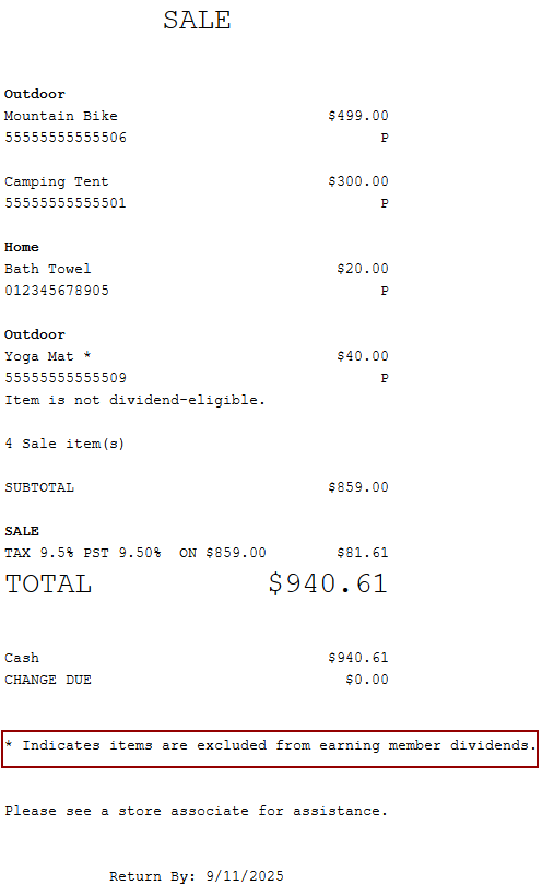 Members can check which items in their purchases earn dividends and which are non-dividend-eligible. Item eligibility for dividends are configured in the Product Catalog. For more information, consult with an NCR Voyix representative.