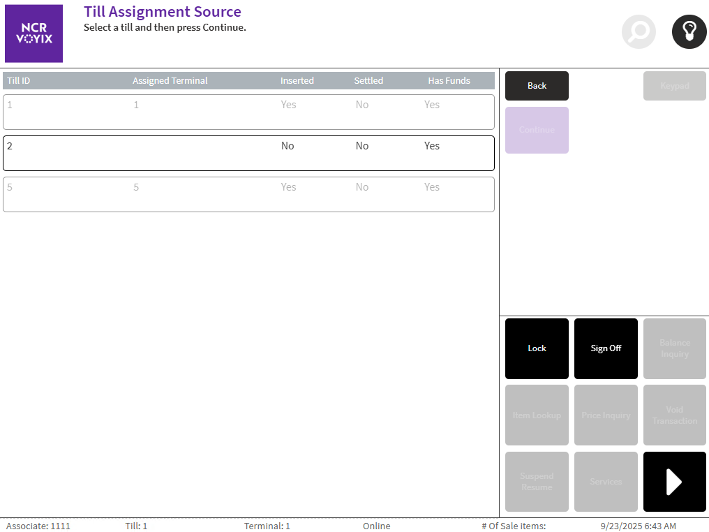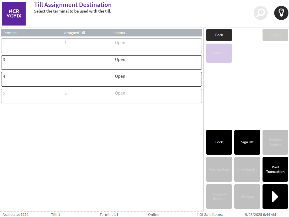 - Select the till to be assigned, and then select Continue. The application displays the Till Assignment Destination screen.