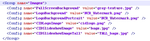 - Locate the Images group in each file and modify the following config elements, this time defining the value for the image file name only.